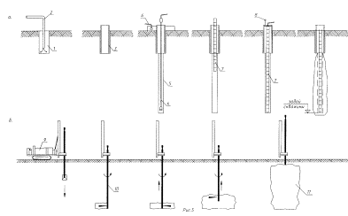 Рис. 10 3.2.3. Бурение цементационных скважин выполняется пневмоударными буровыми станками или станками колонкового бурения с продувкой сжатым воздухом. Диаметр скважин назначается в зависимости от условий работы, состояния кладки усиляемого фундамента и его размеров и обычно находится в пределах 76-112 мм. 3.2.4. При усилении существующих фундаментов цементация выполняется, как правило, в два или три этапа. На первом этапе бурится скважина в пределах усиляемого фундамента и в ней, устраивается или устанавливается кондуктор. Материал и конструкция кондуктора определяется проектом в зависимости от типа и состояния усиляемого фундамента, а также назначением самого реставрируемого или реконструируемого здания. Этот этап не является обязательным и может быть исключен из технологического цикла цементации, если позволяют условия усиления. На втором этапе через кондуктор, при его устройстве, бурится скважина в пределах усиляемого фундамента, не доходя до его подошвы 0,5 м. Скважина заполняется цементационным раствором. После заполнения скважины, в ее устье устанавливается тампон (обтюратор) и производится цементация кладки фундамента под давлением 0,1-0,2 МПа. По окончании цементации скважина выдерживается в течение 1,5-2 суток. На третьем этапе производится повторное разбуривание ствола скважины и тела фундамента до его подошвы и далее, на 0,4-0,5 м, в грунт, после чего цементируется контакт "фундамент-грунт". В этом случае тампон разжимается в кладке фундамента, на уровне 0,5 м выше подошвы. Давление нагнетания раствора при цементации контакта "фундамент-грунт" находится в пределах 0,2-0,4 МПа. 3.2.5. За отказ нагнетания принимается расход цементационного раствора 1л/мин в течение 10 мин при соответствующем давлении нагнетания. При поглощении скважиной объема раствора, превышающего 10-ти кратный объем цементационной скважины без давления цементация должна быть прекращена и скважина выдержана в течение 1,5-2 суток. Затем цементация может быть продолжена до отказа скважины. 3.2.6. Вид и состав цементационных растворов зависит от конструкции, материала, состояния усиляемых фундаментов, инженерно-геологических и гидрогеологических условий площадки строительства и в каждом конкретном случае параметры растворов должны подбираться лабораторией. Б. Устройство буроинъекционных свай. 3.2.7. Технологический цикл устройства буроинъекционных свай включает бурение кладки фундаментов и, в случае необходимости, стен и других конструктивных элементов усиляемых зданий и сооружений, установку кондукторов, бурение скважин в грунте до проектной отметки, заполнение скважин твердеющим раствором, установку в них арматурных каркасов и опрессовку скважин. 3.2.8. Бурение скважин в пределах конструкций усиляемого здания выполняется диаметром, позволяющим устанавливать в них кондукторы, внутренний диаметр которых больше или равен расчетному диаметру буроинъекционных свай. 3.2.9. Бурение скважин выполняется станками пневмоударного или колонкового бурения, в зависимости от типа и состояния существующих фундаментов (конструкций) и типа разбуриваемых грунтов по длине стволов свай. При проходке неустойчивых, обводненных грунтов бурение ведется с использованием проходных шнеков при закрытом нижнем конце бурового става теряемым башмаком или с промывкой скважин глин