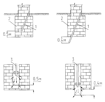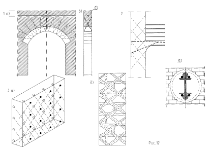 Рис. 11 4.2.2. Проектированию инъекционного укрепления несущих конструкций усиляемого объекта должно предшествовать детальное инженерно-конструкторское обследование его несущих элементов. Обследование должно выполняться по индивидуальной для каждого объекта программе. По ходу обследования и в процессе производства работ программа обследования может уточняться. Степень детализации обследований зависит от размеров объекта, его конструктивной сложности и общего состояния. 4.2.3. При проведении обследования обязательным является определение прочности элементов кладки, состава связующего раствора, степень коррозии армирующих металлических элементов (внутристенных и воздушных связей) состояние их стыков-соединений. Количество и порядок отбора проб и образцов для выполнения лабораторных исследований устанавливается в соответствии с программой и требованиями действующих нормативных документов на исследования образцов строительных материалов. 4.2.4. Инъекционное укрепление несущих конструкций существующих зданий и сооружений рекомендуется выполнять в следующих случаях: - стабилизация деформаций несущих конструкций, вызванных осадками зданий и сооружений и повлекших за собой потерю сплошности кладки с образованием трещин и пустот, потерю прочности или разрывы армирующих элементов (выполняются после стабилизации осадок); - восстановление прочности материала несущих конструкций; - увеличение прочности конструктивных несущих элементов зданий и сооружений при увеличении в ходе реконструкции или реставрации нагрузок на них; - при изменении в ходе реконструкции или реставрации конструктивной схемы объектов, вызывающей изменение или перераспределение действующих нагрузок в отдельных конструктивных элементах или объекте в целом; - увеличение прочности конструктивных несущих элементов или узлов реставрируемых объектов с использованием современных строительных материалов и конструкций.