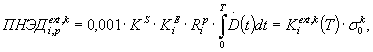 σk0 - средняя плотность загрязнения почвы k-м радионуклидом в НП на дату окончания радиоактивных выпадений, кБк/м2; dks - удельная мощность поглощенной дозы в воздухе гамма-излучения k-го радионуклида для геометрии плоского изотропного источника, расположенного на границе раздела воздух-почва, (нГр/ч)/(кБк/м2); ds137 = 2,55 (нГр/ч)/(кБк/м2); ds134 = 6,85 (нГр/ч)/(кБк/м2); λk - постоянная радиоактивного распада k-го радионуклида, сут.-1; λ137 = 6,33·10-5; λ134 = 9,22·10-4; t - время с момента окончания радиоактивных выпадений в НП, сут. 5.3. Значение прогнозируемой средней эффективной дозы внешнего облучения у i-й группы жителей НП за произвольный период рассчитывается интегрированием выражения (5.1) в заданных временных пределах с учетом выражений (5.2), (5.3) и (5.4). 5.4. Значение прогнозируемой