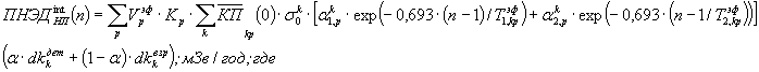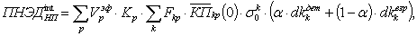 Fkp - интегральный коэффициент, зависящий от скорости снижения со временем удельной активности k-го радионуклида в p-м пищевом продукте и имеющий размерность времени, лет, численные значения которого равны: F90 = 12,0 лет для молока; F134 = 1,3 и 2,8 года для молока и грибов соответственно; F137 = 3,0 и 23,0 года для молока и грибов соответственно (здесь индексами «90», «134», и «137» обозначены радионуклиды 90Sr, 134Сs и 137Сs соответственно);