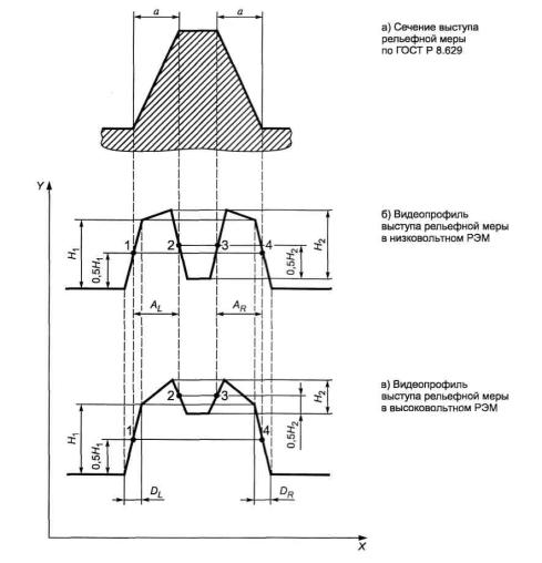 - проводят осмотр футляра, в котором осуществлялось хранение и транспортирование рельефной меры, на отсутствие механических повреждений; - проводят проверку соответствия комплекта поставки рельефной меры данным, приведенным в паспорте (формуляре) на рельефную меру; - выдерживают выбранный экземпляр рельефной меры в помещении, где будет проведена калибровка РЭМ, не менее 24 ч; - извлекают рельефную меру из футляра и осматривают ее для выявления внешних повреждений (царапин, сколов и других дефектов) и загрязнений. При необходимости поверхность меры очищают от частиц пыли струей очищенного и осушенного воздуха. 7.2 Выполняют операции, необходимые для подготовки РЭМ к работе, в соответствии с требованиями инструкции по его эксплуатации. При этом проводят внешний осмотр РЭМ, в процессе которого должно быть установлено: - соответствие комплекта поставки РЭМ данным, приведенным в паспорте (формуляре); - отсутствие механических повреждений всех составных частей РЭМ; - отсутствие механических повреждений соединительных кабелей и сетевых разъемов; - наличие маркировки на РЭМ и ее соответствие данным, приведенным в паспорте (формуляре). 7.3 Устанавливают рельефную меру на рабочий стол РЭМ. 7.4 В соответствии с инструкцией по эксплуатации РЭМ проводят подготовительные операции, которые включают в себя откачку воздуха из камеры образцов, установку ускоряющего напряжения и режимов работы осветительной системы, юстировку электронного зонда в режиме регистрации МВЭ. Ускоряющее напряжение должно обеспечивать требуемые условия функционирования как низковольтного, так и высоковольтного РЭМ. 7.5 При значениях электронно-оптического увеличения РЭМ от 20 до 100 определяют ту область на рабочем столе РЭМ, где расположена рельефная мера. 7.6 Постепенно повышают электронно-оптическое увеличение РЭМ и при этом на каждом этапе проводят фокусировку электронного зонда в соответствии с инструкцией по эксплуатации РЭМ. Повышение электронно-оптического увеличения РЭМ прекращают при появлении на экране монитора микроскопа видеоизображения выступа, который указан в паспорте (формуляре) рельефной меры в качестве исследуемого элемента для калибровки РЭМ. Схематическое изображение наблюдаемого в режиме регистрации МВЭ видеопрофиля для выступа с трапецеидальным профилем, сечение которого изображено на рисунке 1а), приведено на рисунке 1б) - для низковольтного РЭМ и на рисунке 1в) - для высоковольтного РЭМ. На рисунке 1 также приведены обозначения параметров, характеризующих геометрическую форму и размеры выступа. Примечание - Значение электронно-оптического увеличения РЭМ должно обеспечивать получение изображений, которые позволяют определить значения параметров, приведенных на рисунке 1б) и в). 7.7 Проверяют установку рельефной меры на рабочем столе РЭМ в соответствии с инструкцией по его эксплуатации. При этом проверяют: - параллельность вертикальной оси изображения относительно перпендикуляра к поверхности рельефной меры. Для обеспечения параллельности поворачивают рельефную меру вокруг оси, перпендикулярной к плоскости ее поверхности, или осуществляют электронное вращение растра РЭМ, если такая возможность предусмотрена конструкцией РЭМ; - параллельность плоскости рельефной меры относительно направления строчной развертки РЭМ, что подт