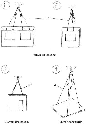 6 СХЕМЫ СТРОПОВКИ СБОРНЫХ ЭЛЕМЕНТОВ ДОМАСхемы строповки разрабатываются на сборные элементы дома (наружные и внутренние панели и перегородки, плиты перекрытий и покрытий, блоки инженерных коммуникаций, детали шахты лифтов и т.д.) и на непроизводственные грузы (поэтажная прорабская, будка герметчика, контейнеры с монтажной оснасткой и т.д.). Схемы строповки разрабатывают по рабочим чертежам сборных элементов, с учетом их конструкции, габаритов и масс, расположения монтажных петель. Схемы строповки применяют, как правило, типовые, то есть одна схема применяется для строповки ряда однотипных элементов. Если в спецификации сборных элементов дома указывается несколько их десятков, то необходимое число схем их строповки и строповки непроизводственных грузов не превышает обычно 25. Схемы строповки нумеруют и приводят в проекте производства работ на трех-четырех листах формата А2 или A3. На рис. 1 приведены в качестве примера первые четыре (в кружках) схемы строповки, номерами 1 и 2 обозначены грузозахватные приспособления, указанные в разделе 5.