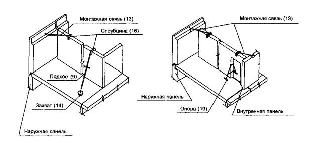 Масса сборных элементов и номера схем их строповок указаны в соответствующих разделах технологических карт. 8 ВРЕМЕННОЕ КРЕПЛЕНИЕ МОНТИРУЕМЫХ СБОРНЫХ ЭЛЕМЕНТОВУстойчивость сборных элементов дома в процессе монтажа обеспечивается за счет временного крепления. Схемы временного крепления разрабатывают на наружные и внутренние панели, на перегородки, плиты перекрытий и покрытий, блоки инженерных коммуникаций, детали шахты лифтов и т.д. Схемы временного крепления разрабатывают по рабочим чертежам дома и сборных элементов, с учетом их конструкции, габаритов и масс, расположения монтажных петель. Схемы временного крепления применяют, как правило, типовые, то есть одна схема применяется для крепления ряда однотипных элементов. Если дом монтируется из сборных элементов нескольких десятков наименований, то схемы временного крепления разрабатывают на типовые элементы, число которых составляет не более полутора десятков. Схемы временного крепления приводят в проекте производства работ на листах формата А2 или A3. На рис. 2 приведены в качестве примера типовые схемы временного крепления наружных и внутренних панелей. Цифрами в скобках обозначены монтажные приспособления, указанные в разделе 5. Временное крепление наружных панелей осуществляется с помощью отверстий в плитах перекрытия (схема 1а) или фундаментных блоков (схема 1б). Для крепления внутренних панелей без проемов применяются подкосы с захватами и струбцинами и монтажные связи со струбцинами (схема 2). Для крепления внутренних панелей с проемами применяются опоры и монтажные связи со струбцинами (схема 3). Если временное крепление в двух точках осуществить невозможно, то в одной из точек выполняют на подвесе крюка крана постоянное крепление по проекту. Фризовые панели чердака временно закрепляют двумя подкосами (9). Внутренние панели чердака временно закрепляют с двух сторон опорами (20). Перегородки временно закрепляют стойками (21). 9 КАЧЕСТВО МОНТАЖНЫХ РАБОТ9.1 Качество монтажных работ оценивают степенью соответствия фактических и проектных (нормативных по СНиП 3.03.01, ВСН 202) показателей и параметров монтажа дома из сборных железобетонных элементов. Качество монтажных работ обеспечивается входным, операционным и приемочным контролем подготовительных и монтажных работ. 9.2 Контролируемые показатели и параметры, способы их измерения и оценки приведены ниже.
