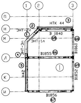 На рис. 8 показан фрагмент схемы на первой захватке (I). Из рис. 8 видно, как следует временно крепить наружные и внутренние панели. Так, крепление, например, наружной панели Н42 осуществляется в двух точках с помощью двух подкосов 9. Один конец подкоса вставляют в петлю панели, а другой закрепляют в плите перекрытия с помощью захвата 14 (см. схему la, рис. 2). Внутренняя панель, например, панель В1852 крепится в одной точке упомянутым подкосом 9, а в другой - опорой 19.