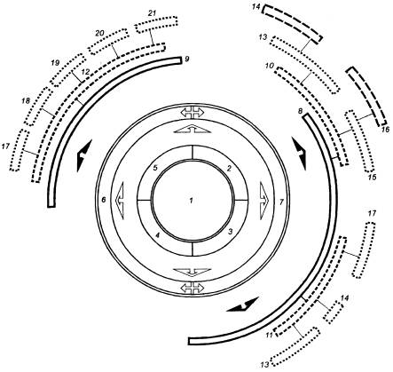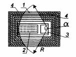 Экспликация: 1 - трибуны; 2 - партер; 3 - эстрада; 4 - «потерянные» места. Примечания: 1. Над чертой приведены данные для залов с ареной размером 65×36 кв.м, под чертой - с ареной 48×26 кв.м. 2. α - максимально допустимый горизонтальный угол, в пределах которого должны располагаться зрительные места; R - максимально допустимое удаление зрительских мест. |