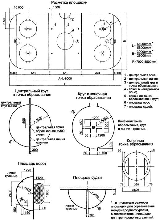 1 - линия ворот*; 2 - средняя линия*; 3 - боковая линия*; 4 - центральный круг*; 5 - отметка 12-метрового удара; 6 - точка штрафного удара; 7 - центральная отметка; 8 - ворота; 9 - съемный бортик для перехвата мячей; 10 - место углового флага; 11 - место флага средней линии; 12 - граница ледовой поверхности; 13 - зона безопасности; 14 - стол судьи-секретаря; 15 - места удаленных игроков; 16 - места запасных игроков; 17 - зона зрительских мест.