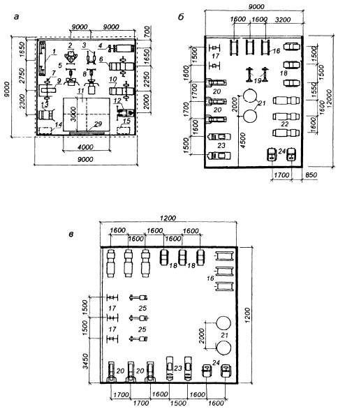 а - планировочная схема помещения с расстановкой тренажеров из набора АП-2; б, в - планировочные схемы помещений для групповых занятий по общей физической подготовке на пристенном трансформируем оборудовании и тренажерах