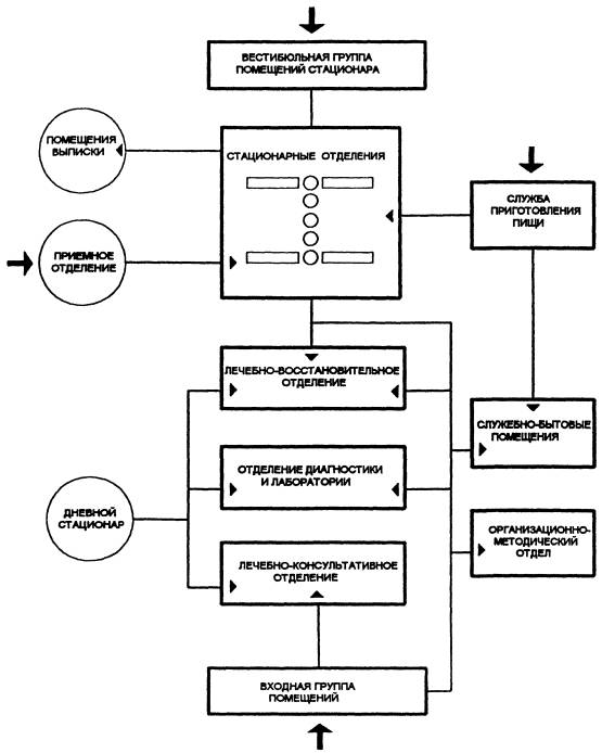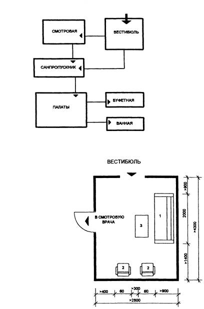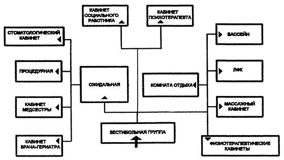 Рис. 3. Функциональные связи групп помещений гериатрического центра 5.13 Функциональная структура лечебно-консультативного отделения (ЛКО) гериатрического центра может включать следующие основные группы помещений: - вестибюльную группу помещений; - отделение врачебного приема; - дневной стационар; - помещения МСЭК; - административно-хозяйственное отделение. 5.14 Состав помещений ЛКО определяется преимущественным характером заболеваемости лиц старшего поколения и соответствует соотношению обращаемости пожилых людей к врачам разной специальности. 5.15 В структуру лечебно-консультативного отделения могут входить стоматологические отделения, аптеки, оптики. Стоматологическое отделение может включать кабинеты терапевтической, хирургической, ортопедической стоматологии, зуботехническую лабораторию, стерилизационную. Минимальную площадь помещений стоматологических отделений, аптек следует принимать в соответствии с Пособием по проектированию учреждений здравоохранения (к СНиП 2.08.02). 5.16 Врачебные кабинеты общего профиля (гериатра, невропатолога, психиатра) должны иметь площадь не менее 15 м2, а специализированные - 18 м2, офтальмологический кабинет должен иметь длину не менее 5 м для определения остроты зрения. При специализированных кабинетах (уролога, дерматолога) необходимо предусматривать кабину или уборную со сливом. 5.17 Ширина лечебно-консультативных помещений принимается не менее, м: - для кабинетов врачей - 2,4 м, - для процедурных с урологическим креслом, кабинетов гинекологических, урологических, ортопедических - 3,2 м. 5.18 При лечебно-консультативных отделениях гериатрических центров целесообразно предусмотреть отдельно стоящие пансионаты для приезжих пациентов для их пребывания в течение консультации, обследования и лечения. В состав помещений пансионатов включаются отдельные помещения медицинского назначения (пост медсестры, процедурная, клизменная). 5.19 Глубина лечебно-диагностических помещений не должна превышать 6 м. Отношение глубины и ширины лечебно-диагностических помещений должно быть не менее 2. 5.20 Лечебно-диагностические помещения должны иметь естественное освещение. 5.21 Во всех кабинетах необходимо предусмотреть установку умывальников. 5.22 Площадь ожидальных и вестибюлей-гардеробных рассчитывается с учетом числа посетителей и сопровождающих, одновременно находящихся в учреждении по таблице 1. 5.23 Состав и площадь помещений ЛКО определяются заданием на проектирование в соответствии со структурой и спецификой учреждения с учетом приложения А. 5.24 Состав и рекомендуемая площадь служебных и бытовых помещений разной мощности следует принимать в соответствии с Пособием по проектированию учреждений здравоохранения (к СНиП 2.08.02). 5.25 Дневной стационар предназначен для пребывания в течение нескольких часов больных, которым последовательно проводится несколько диагностических исследований или лечебных процедур. В его составе организуются палаты с постом дежурной медсестры, кабинет врача, процедурная, санитарно-гигиенические помещения, помещение дневного пребывания пациентов и приема пищи, кладовые для грязного и чистого белья. Рекомендуемая площадь помещений дневного стационара представлены в таблице А.3 приложения А. 5.26 Помещения диагностического отделения (ДО) включают: рентгеновское отделен