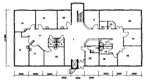 13. Кабинет физиотерапии; 14. Массажный кабинет; 15. Ингаляторий с компрессорной; 16. Кабинет методиста с кладовой инвентаря; 17. Мужская и женские раздевалки с душевыми; 18. Тренажерный зал; 19. Зал ЛФК; 20. Комната сестры-хозяйки; 21. Кладовая грязного белья; 22. Кладовая уборочного инвентаря; 23. Кладовая персонала с уборной.