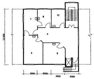 1. Вестибюль-гардеробная для посетителей; 2. Ожидальная для посетителей; 3. Уборная; 4. Кладовая; 5. Кабинет врача-гериатра с темной комнатой; 6. Кабинет медицинской сестры; 7. Процедурная; 8. Кабинет физиотерапии.