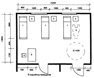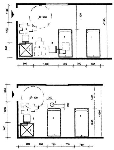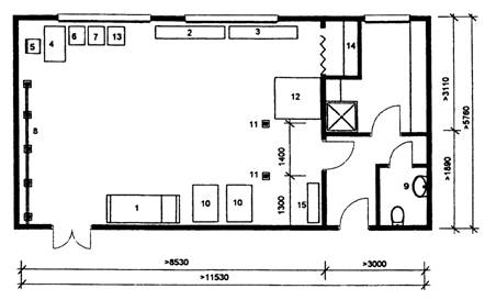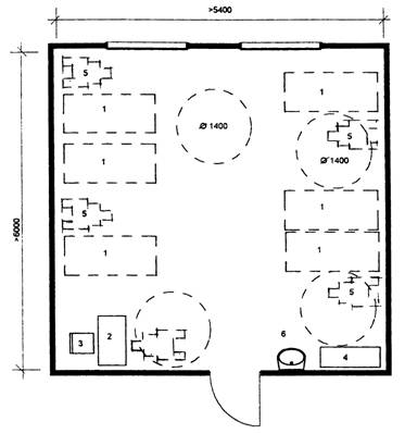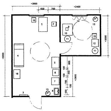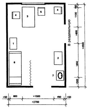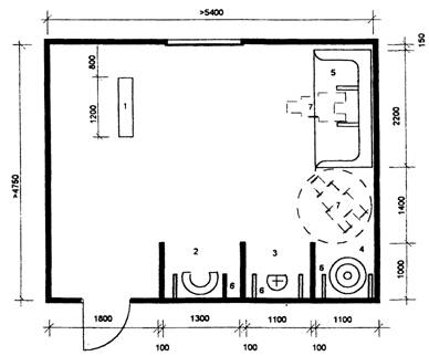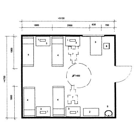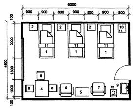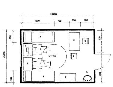 1. Место для тренажера; 2. Стол медицинской сестры; 3. Стул; 4. Шкаф; 5. Инвалидная коляска; 6. Умывальник.