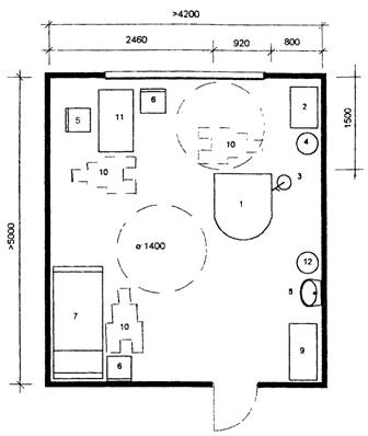 1. Кресло гинекологическое; 2. Столик инструментальный; 3. Светильник однорефлекторный передвижной; 4. Стул винтовой; 5, 6. Стул; 7. Кушетка; 8. Умывальник керамический; 9. Шкаф медицинский; 10. Инвалидная коляска; 11. Стол врача; 12. Бачок для мусора.