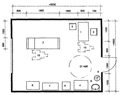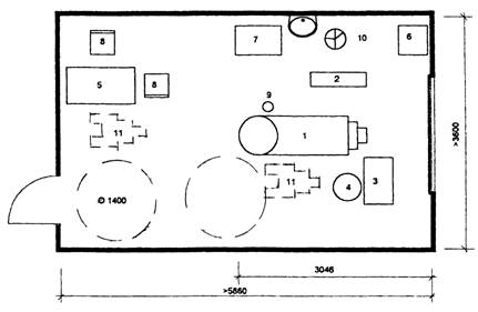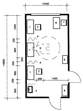 1. Стационарная ингаляционная установка; 2. Стул с подлокотниками; 3. Умывальник; 4. Экран; 5. Инвалидная коляска; 6. Стол врача; 7. Стул полумягкий; 8. Шкаф медицинский; 9. Столик инструментальный.
