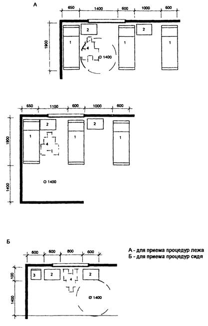 1. Кушетка процедурная; 2. Стол для переносной аппаратуры; 3. Стул с подлокотниками; 4. Инвалидная коляска.