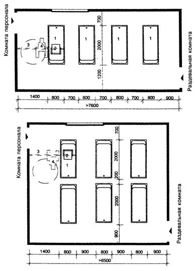 1. Кушетка медицинская; 2. Ванна прямобортная; 3. Тумба прикроватная; 4. Табурет; 5. Умывальник; 6. Шкаф для медико-хозяйственных принадлежностей; 7. Полотенцесушитель; 8. Вешалка на два крючка; 9. Подъемник для перемещения больного в ванну; 10. Каталка; 11. Душ.