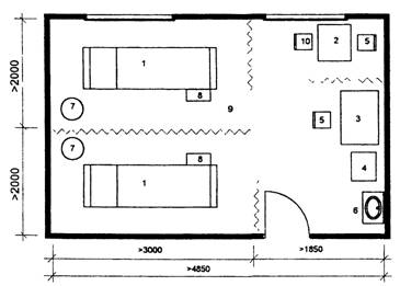 1. Стол медсестры; 2. Тумбочка прикроватная; 3. Стул полумягкий; 4. Шкаф для поста дежурной медсестры; 5. Система наблюдения; 6. Прикроватное устройство; 7. Кровать функциональная; 8. Столик инструментальный; 9. Штатив для длительных вливаний; 10. Отсасыватель хирургический; 11. Дефибрилятор импульсный; 12. Аппарат иск. вент. легких; 13. Холодильник бытовой; 14. Облучатель бактерицидный; 15. Слив больничный; 16. Умывальник; 17. Мойка чугунная.