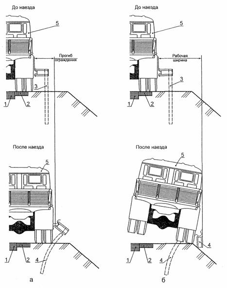 1 - проезжая часть, 2 - укрепительная полоса; 3 - недеформированное ограждение; 4 - деформированное ограждение, 5 - транспортное средство
