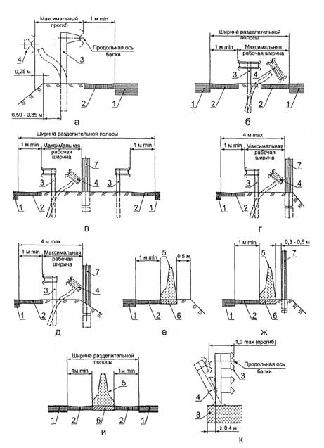 Примечание: i - продольный уклон проезжей части, R - радиус кривой в плане. проезжая часть мостового сооружения расположена на расстоянии более 5 м от поверхности водотока или водоема глубиной более 1 м; длина мостового сооружения более 250 м; эстакады третьего и выше уровней пересечений в разных уровнях. В остальных случаях дорожные условия на мостовых сооружениях в городах относят к группе Ж. Минимальные уровни удерживающей способности ограждений, устанавливаемых на съездах пересечений и примыканий в разных уровнях автомобильных дорог и улиц, принимаются равными: УЗ - для ограждений, устанавливаемых на правоповоротных съездах с одной полосой движения; У4 - для ограждений, устанавливаемых на правоповоротных съездах с двумя полосами движения и на левоповоротных съездах; У5 - для ограждений, устанавливаемых на мостовых сооружениях съездов. Минимальные уровни удерживающей способности ограждений, устанавливаемых в автодорожных и городских тоннелях, должны соответствовать требованиям таблицы 7. Для соединения мостовых и дорожных ограждений, а также для соединения ограждений разных типов и конструкций должны устраиваться переходные участки ограждений. Конструкция переходного участка, соединяющего ограждение мостовой и ограждение дорожной группы, должна обеспечивать плавный переход от удерживающей способности и высоты мостового ограждения к удерживающей способности и высоте дорожного ограждения. В любом случае уровень удерживающей способности переходного участка ограждений не должен быть меньше самого низкого из допустимых уровней удерживающей способности, установленных для соединяемых ограждений, и больше самого высокого из них. 3.2. Определение максимального прогиба, максимальной рабочей ширины, минимальной высоты огражденияПрогиб барьерного ограждения, устанавливаемого на обочине, не должен превышать расстояние от продольной оси балки недеформированного ограждения до бровки земляного полотна, увеличенное на 0,25 м (Приложение 1, рис. 2а), Рабочая ширина не должна превышать расстояние от лицевой поверхности балки ограждения до массивного препятствия, находящегося на обочине или за ее пределами на расстоянии менее 4 м от кромки проезжей части (Приложение 1, рис. 2г, д). Рабочая ширина для барьерного ограждения, устанавливаемого на разделительной полосе автомобильных дорог, городских дорог и улиц, а также мостовых сооружений, не должна превышать: расстояние от лицевой поверхности балки ограждения до края проезжей части (Приложение 1, рис. 2б) при установке ограждения по середине разделительной полосы шириной менее 3 м при отсутствии на ней массивных препятствий; Прогиб ограждения на мостовом сооружении