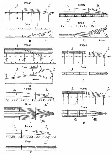 Парапетные ограждения не должны препятствовать отводу воды с поверхности проезжей части, обочин (полос безопасности) дорог и мостовых сооружений. Конструкция ограждения на протяжении участка с одним и тем же уровнем удерживающей способности должна быть одинаковой. При сопряжении барьерных мостовых ограждений с ограждениями на подходах к мосту на дорогах I-III категорий требуется их выравнивание в плане. При этом необходимо обеспечить минимальную длину отгона мостовых ограждений в сторону обочины в соответствии с Рекомендациями [21]. Конструкция ограждения на переходном участке должна соответствовать требованиям технической документации. На переходных плитах в узлах сопряжения мостового сооружения с насыпями подходов устанавливают ограждения той же конструкции, что и на мостовом сооружении. Начальный и конечный участки барьерного и парапетного ограждения, устанавливаемого на обочине, устраивают с отгоном 1:20 к бровке земляного полотна. При этом балки барьерных ограждений и верхние плоскости парапетных ограждений понижают до поверхности дороги (Приложение 1, рис. 4а, б). Минимальные размеры участков приводятся в таблице 10. Допускается применение концевых элементов в ограждениях, выполненных по ГОСТ 26804 или по технической документации, согласованной с надзорным органом (например, по типовой серии 3.503.1). Начальный и конечный участки одностороннего барьерного ограждения допускается выполнять с изгибом балки в "форме петли длиной не менее 5,00 м. При этом расстояние от бровки земляного полотна до ближней стойки. должно быть не менее 0,25 м (Приложение 1, рис. 4 в). Начальные и конечные участки балки одно- и двусторонних барьерных ограждений и верхние плоскости парапетных ограждений, устанавливаемых на разделительной полосе, понижают до земли с уклоном 1:15 (Приложение 1, рис. 4 г-ж). Односторонние ограждения сближают к оси разделительной полосы (Приложение 1, рис. 4 д, е). В местах технологических разрывов разделительной полосы, разворота, пересечений и примыканий в одном уровне, у постов дорожно-патрульной службы и т.п. допускается устраивать понижение балок или верхних плоскостей парапетных ограждений до земли с уклоном 1:10 (Приложение 1, рис. 4г-ж). При установке ограждений барьерного типа должен быть обеспечен безопасный просвет под нижней балкой, составляющий величину в пределах: 300-450 мм - для ограждений, устанавливаемых в населённых пунктах, а также в тоннелях; 350-450 мм - в остальных случаях. Для обеспечения видимости удерживающих ограждений в темное время суток на них должны быть установлены световозвращатели, изготовленные по ГОСТ Р 50971 или по технической документации, согласованной с надзорным органом. Световозвращатели следует размещать: на барьерных ограждениях с балкой(-ами) волнистого профиля - в углублении в средней части поперечного профиля балки (при наличии нескольких рядов балок - в углублении средней части поперечного профиля нижней балки); на барьерных ограждениях с балкой неволнистого профиля - над верхней гранью верхней балки или на опоре над ней; на парапетных ограждениях - на верхней плоскости ограждений. Световозвращатели устанавливаются по всей длине ограждения с интервалом 4 м (в т.ч. на участках отгона и понижения). В Приложении 2 (рис. 9а-б) приведен пример световозвращателя, характеристики которого регламен