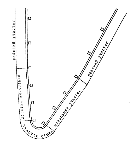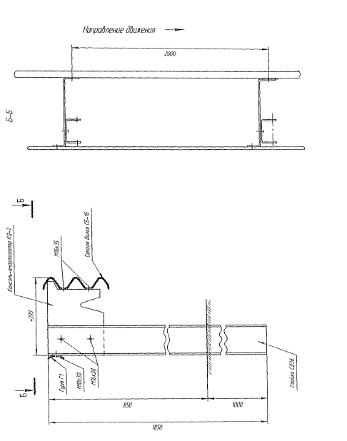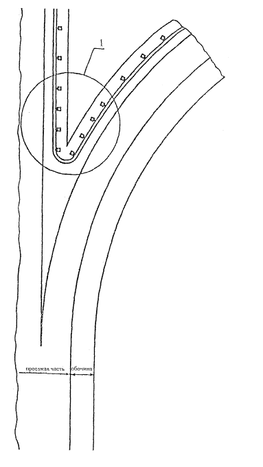 Рис. 8б - участок стыка состоит из секции радиусной выпуклой балки; - при стыковке с балкой СБ-5 (по ГОСТ 26804 или типовой серии 3.503.1) радиусная выпуклая балка располагается сверху в местах слияния транспортных потоков и снизу - в местах разветвления.