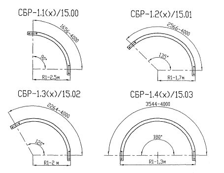 Радиусные балки выпуклые, выпускаемые по ТУ 5216-067-36910961-2002 (х) - размер радиуса в м, изготавливаются из профиля А, В