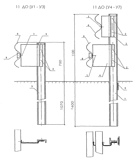 Рис. 10а 1 - Болт М 16×45 ГОСТ 7802-81. Гайка M 16 ГОСТ 5915-70 2 - Болт М 16×30 ГОСТ 7798-70. Гайка М 16 ГОСТ 5915-70 3 - Стойка СА-1.8 Ш12. 4 - Консоль КН 5 - Консоль KB 6 -Балка СБ 1 7 - Стойка СД-2,6 Д12 (СД-2,6 ДМ; СД-2,6 Д12* для У7) 8 - Элемент световозвращающий 9 - Пластина 200×300