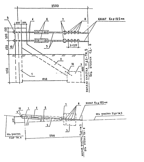 Начальный участок (ИДО - ТЖ.Н) 1 - стойка СД-6; 2 - стойка СД-7; 3 - упор; 4 - тяж; 5 - тяж с проушиной; 6 - стяжка; 7 - коуш; 8 - сжим; 9 - гайка; 10 - шайба; 18-анкер (Ø 20 AI, l = 300, 0,74 кг)