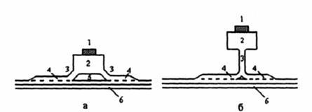 Рис. 1 Основные схемы размещения объектов сервиса относительно основной дороги: а - линейная; б - тупиковая; 1 - здание объекта; 2 - стоянка; 3 - подъезды; 4 - переходно-скоростные полосы; 5 - газон; 6 - основная дорога Самой распространенной и в наибольшей степени отвечающей потребностям проезжающих является линейная схема. Она характеризуется размещением всей территории объекта или ее части в пределах полосы отвода основной дороги или на площадке, непосредственно примыкающей к ней. Эта схема предусматривает отдельные въезд и выезд с организацией одностороннего движения. Удаление кромки покрытия на стоянке от края проезжей части основной дороги должно быть не менее 6 м (минимально допустимое удаление независимо от категории дороги составляет - 2,7 м). Территорию объектов, расположенных согласно данной схеме, желательно отделять от основной дороги полосой зеленых насаждений либо островком безопасности шириной 6-20 м. При этом основное здание объекта сервиса должно быть расположено в наиболее удаленной по отношению к основной дороге части территории на расстоянии не менее 30 м от края проезжей части основной дороги. В случае расположения объектов сервиса (пунктов питания и торговли) на территории придорожных населенных пунктов это расстояние должно быть не менее 20 м. Тупиковая схема представляет собой размещение территории объекта за пределами полосы отвода основной дороги (или у ее границы) в прилегающей зоне и соединение ее с дорогой одним подъездом, проектируемым как примыкание, по которому осуществляются въезд на территорию и выезд с нее. Ширина проезжей части такого подъезда должна быть не менее 4,5 м с обочинами по 1,75 м, укрепленными по 0,75 м с каждой стороны. Подъезд должен заканчиваться стоянкой, которая кроме расчетного количества стояночных мест для автомобилей включает поворотное кольцо радиусом по оси проезда не менее 12 м для организации кругового движения или площадку для разворота размером не менее 20×20 м. Как правило, влияние на безопасность и режим движения расположенных таким образом объектов аналогично примыканию в одном уровне второстепенной дороги. Для обеспечения удобства и безопасности движения пешеходов в генеральном плане объектов сервиса должны быть предусмотрены тротуары и пешеходные дорожки. При расположении объектов на территории придорожных населенных пунктов параметры этих элементов устанавливаются согласно нормативным требованиям [10]. В остальных случаях пешеходные дорожки располагают за пределами обочин основной дороги не ближе 2,7 м от кромки проезжей части. Ширина тротуаров и пешеходных дорожек определяется интенсивностью движения пешеходов в часы "пик". Минимальное значение данного параметра составляет 1,0 м. При интенсивности движения пешеходов от 100 до 1000 и более чел/ч ширина дорожки должна составлять 1,5 м с последующим увеличением на одну полосу шириной 0,75-м на каждую тысячу пешеходов в час. Для обеспечения безопасности движения и удобства обслуживания проезжающих должно быть предусмотрено освещение территории объектов сервиса, параметры которого регламентируются нормами для соответствующих предприятий [11]. Освещение стоянок в темное время суток обязательно. При этом не должно допускаться ослепление проезжающих по основной дороге. Стоянки и подъезды к объектам сервисаПлощадка 