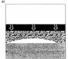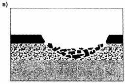 Рис. 3. Разрушение дорожной одежды: а - накопление воды на дорожном покрытии и ее проникание через трещины в нижележащие слои дорожной одежды; б - миграция воды в слоях дорожной одежды под действием нагрузки; в - разрушенный участок дорожной одежды Для принятия обоснованных решений необходима точная оценка расчетных гидрометеорологических условий в заданном районе с использованием имеющихся данных проектных разработок прошлых лет и опыта эксплуатации построенных сооружений. В случае применения новых схем и сооружений необходимо тщательно анализировать особенности их функционирования и при возможности проводить лабораторные исследования их работоспособности, так как косвенные, необоснованные аналогии с имеющимися конструкциями недопустимы. Кроме того, использование новых конструктивных элементов в системе дорожного водоотвода может потребовать проведения дополнительных исследований с целью разработки методов оценки исходных гидрометеорологических параметров проектирования. Конструкции дорожного водоотвода относятся к сооружениям специального назначения и не только испытывают воздействия природно-климатических факторов, но и под их влиянием способны оказывать негативное влияние на прилегающую природную среду. Преждевременные разрушения и засорение водоотводных конструкций, зачастую обусловленные отсутствием расчетов их пропускной способности и надлежащей апробации, а иногда и опыта строительства подобных сооружений, а также отсутствием оборудования для их содержания приводят, прежде всего, к переувлажнению грунтов земляного полотна. Выбор и назначение схемы водоотвода автомобильной дороги могут, как значительно уменьшать неблагоприятное влияние гидрологических и гидрогеологических факторов, так и ускорять их отрицательное воздействие на автомобильную дорогу в целом, что указывает на необходимость тщательной проработки всех возможных вариантов систем дорожного водоотвода на стадии проектирования. Некоторые водоотводные конструкции абсолютно не приемлемы для устройства на откосах насыпей автомобильных дорог, однако случаи строительства этих конструкций и их неудовлетворительного функционирования имели место. В настоящее время в практике проектирования и строительства автомобильных дорог в России и зарубежных странах существуют следующие схемы организации поверхностного водоотвода. Схема 1 характеризуется свободным стеканием воды по поверхности проезжей части автомобильной дороги на обочины, далее на откосы и затем в боковые водоотводные канавы (кюветы). Скорость стекания воды в этом случае определяется параметрами продольных и поперечных уклонов проезжей части и обочин, а также типом и состоянием покрытия проезжей части, регламентированным типовым проектом на дорожные одежды. При этом для защиты от размывов необходимо укреплять откосы земляного полотна и кюветы. Поперечные сечения водоотводных сооружений назначаются на основе результатов гидрологических и гидравлических расчетов. Различные способы укрепления обочин и откосов земляного полотна автомобильных дорог регламентируются типовыми проектными решениями, требованиями нормативных документов и методическими рекомендациями. Поверхностный сток, притекающий к подошве откосов земляного полотна, при прохождении