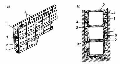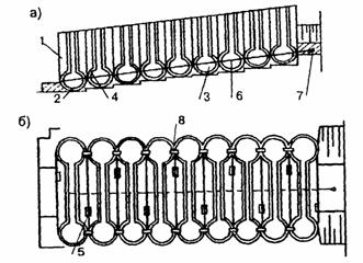 Рис. 24. Водоотводное устройство В.И. Афиногеева: а - разрез; б - план; 1 - водоотводный лоток; 2 - полукольцо; 3 - аккумулирующая полость; 4 - перегородка; 5 - окно; 6 - трос; 7 - анкер; 8 - скоба Для сбора и отвода воды