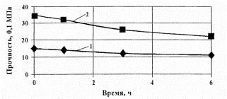 Рис. 40. Зависимость прочности укрепленных грунтов после 10 циклов замораживания-оттаивания от времени начала уплотнения смеси: 1 - песок; 2 - суглинок