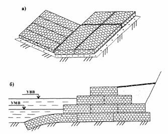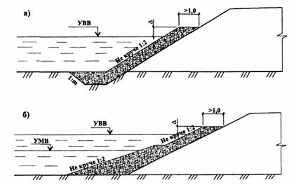 Рис. 3. Укрепление откоса каменной наброской: а - при отсутствии меженных вод; б - при наличии меженных вод; Δ - технический запас, равный сумме подпора, высоты набега волны на откос плюс 0,5 м