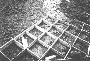 Рис. 15. Укрепление откосов одерновкой: а - сплошной; б - в клетку; 1 - отдельная дернина; 2 - деревянные спицы Для одерновки применяют свежесрезанный луговой дерн, заготавливаемый в местах, где грунтовые условия сходны с условиями укрепляемого откоса. Применение такого способа крепления наиболее целесообразно при наличии дернорезов и дерноукладчиков, а также местного дерна.