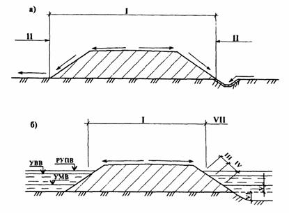 Рис. 9. Укрепление откосов механизированным посевом трав: а - откос насыпи; б - откос выемки При обосновании выбора типа укреплений руководствуются следующей классификацией зон гидрометеорологических воздействий на дорожное полотно и его конструктивные элементы применительно к двум условиям функционирования (рис. 10): I - зона ударного воздействия атмосферных осадков, стекания поверхностных вод, эрозии, дефляции и других факторов, действующих на поверхность дороги в условиях ее неподтопления; II - зона концентрации и движения вдоль подошвы дорожного полотна поверхностных вод, стекающих с дороги, и прилегающей к ней местности;