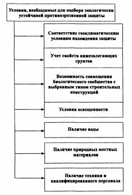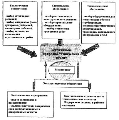 Рис. 11. Схема обеспечения устойчивого функционирования природно-технического объекта Таким образом, биолого-техническая защита представляет собой комбинацию инженерных и биологических методов, в результате реализации которых создается ПТС, позволяющая сохранять и восстанавливать окружающую среду. Техническая составляющая представляется различного типа строительными конструкциями, образующими матрицу защитного экрана. Назначение матрицы обеспечение устойчивого закрепления биологической составляющей системы для поддержания корнеобитаемого слоя и создание благоприятных условий для развития биологического сообщества на самом сложном начальном этапе жизненного цикла ПТС. 3. ОТКОСЫ АВТОМОБИЛЬНЫХ ДОРОГ КАК ОБЪЕКТЫ БИОЛОГО-ТЕХНИЧЕСКОЙ ЗАЩИТЫАвтомобильные дороги в пересеченной местности часто проходят в насыпях и выемках, в разных климатических зонах. В зависимости от степени пересеченности местности и категории дороги площадь поверхности откосов может составлять от 180 до 3200 тыс. м2 на 100 км трассы. В ходе строительства часто нарушаются грунтовые слои и формации, перемещаются зеленые насаждения, удаляется растительный слой и изменяется естественный рельеф. Эти изменения приводят к развитию осыпей, вывалов локального скольжения и наиболее опасных эрозионных процессов в районе обочин и полос отвода автомобильных дорог. Неконтролируемая эрозия часто приводит к необходимости коренных изменений укрепляющих конструкций или сооружению дополнительных дорогостоящих устройств. Насыпи и выемки автомобильных дорог можно рассматривать как природно-техническую систему, состоящую из двух различных по своей природе компонентов: биологического и строительного. Доля биологического и строительного компонента может варьировать, в частном случае ПТС может быть чисто биологической. Биологическая составляющая ПТС включает растительный грунт и посадочный материал. При этом объем растительного грунта должен быть минимальным, чтобы оптимальным образом обеспечить устойчивое функционирование системы. Устойчивое развитие биологической составляющей ПТС может быть достигнуто в результате: - последовательного усложнения видового состава растительного сообщества в активной фазе жизненного цикла ПТС; - начального запуска ПТС как результата сложного взаимодействия в многовидовом фитоценозе; - обеспечения фитоценоза достаточным количеством питательных веществ (энергетическая составляющая ПТС). Стоимость восстановления и содержания поврежденных участков находится в прямой зависимости от объема вынесенного с эрозией грунта. Американскими учеными в шт. Миннесота еще в 1983 г. были обследованы автомобильные дороги общей протяженностью 185 тыс. км, что позволило оценить не только степень эрозии, но и причину ее возникновения и составить рекомендации по предотвращению этого явления. Обследование проводили дважды: весной после таяния снегов до начала роста трав и осенью после прекращения роста трав до начала заморозков. Всего было выявлено примерно 18 тыс. участков, подверженных эрозии. При этом общий объем эрозионного выноса составил около 3,3 млн. м3, а распределение эрозионных повреждений в зависимости от типа местности приведено в табл. 1. Таблица 1 Распределение эрозионных повреждений в зависимости от типа местности