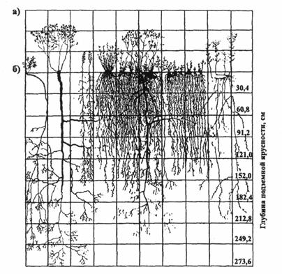 Рис. 12. Ярусность надземная (а) и подземная (б) в травянистом сообществе Почвозащитная способность однолетних культур и в меньшей степени многолетних трав изменяется в течение года. Она увеличивается по мере накопления растительной массы и резко падает в осенне-весенний период. Поэтому часто почвозащитную способность определяют по отдельным фазам развития растений. Однако реальная почвозащитная эффективность культуры определяется не только динамикой ее развития, но и внутригодовым распределением эрозионно-опасных ливней [9]. В процессе активного жизненного цикла ПТС (эксплуатационный период), исходя из опыта, накопленного в области луговодства, должны быть учтены следующие факторы: - урожайность травостоя, который в значительной степени зависит от его ботанического состава; - внесение удобрений для поддержания растительного покрова должно быть дифференцированным в зависимости от видового состава; - при внедрении в сеяный травостой дикорастущих видов растений продуктивность фитоценозов падает. Для стабилизации эрозионных процессов (ветровая и водная эрозия), приводящих к оползням и обвалам, наиболее надежным и целесообразным способом с точки зрения экологии является создание растительного дернового слоя на склонах и откосах. В формировании радиационного режима растительного покрова его архитектоника является одним из наиболее существенных, но в то же время и наиболее трудно учитываемых факторов. Трудность заключается прежде всего в большом многообразии и сложности структуры растительного покрова. Наиболее важные с точки зрения радиационного режима и фотосинтетической деятельности элементы растительного покрова - листья - имеют различную длину и ширину, отличаются друг от друга по форме, числу (сложные листья состоят из большого числа отдельных листочков) и т.д. Отдельные виды растений также отличаются друг от друга по габитусу, длине, диаметру, количеству ассимилирующей поверхности и т.д. Изучение и сравнение перечисленных особенностей является предметом морфологии растений. Исходя из методических соображений, фитометрическое описание растительного покрова целесообразно проводить на четырех уровнях: отдельные органы растений, целое растение, одновидовая группировка и растительное сообщество. Каждый более высокий уровень содержит в себе элементы предыдущих уровней, но, не являясь простой совокупностью элементов нижнего уровня, имеет и свои специфические закономерности. Густой и мощный растительный покров, как известно, поглощает около 60 - 90 % падающей коротковолновой радиации солнца и неба, 10 - 30 % отражается и лишь 5 - 10 % проходит сквозь растительный покров и поглощается почвой. Кроме того, растительный покров поглощает из воздуха большое количество углекислого газа и выделяет в атмосферу кислород. Существенна роль растительного покрова также в формировании водно-теплового режима подстилающей поверхности. Благодаря этим особенностям, растительный покров является активным климатообразующим фактором и наличие его заметно влияет на формирование и ход физических процессов в атмосфере, особенно в приземном слое [10]. 4. БИОЛОГИЧЕСКИЕ АСПЕКТЫ СОЗДАНИЯ КОМПЛЕКСНОЙ ЗАЩИТЫ ОТКОСОВ АВТОМОБИЛЬНЫХ ДОРОГТипы укрепления откосов автомобильных дорог общего пользования назначают, как правило, применительно