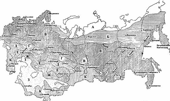 Рис. 14. Карта-схема природных зон Российской Федерации и стран СНГ: А - тундровая зона; Б - лесотундра; В - лесная зона; Г - лесостепная зона; Д - степная зона; Е - сухостепная зона; Ж - пустынно-степная зона; З - пустынная зона; К - горные районы Основные характеристики многолетних трав, рекомендуемых для укрепления откосов земляного полотна