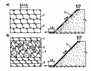 Рис. 8. Укрепление откоса геоячейками: а - геоячейки из геотекстильных водопроницаемых лент;