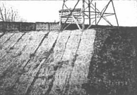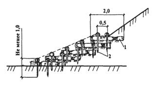 Рис. 18. Плетневое прорастающее укрепление: 1 - двухкомельные фашины; 2 - ивовые колья толщиной 0,06 м Прорастающие плетни наиболее устойчивы против размывающего действия потока и раньше других видов посадок начинают проявлять свои гидротехнические свойства, но стоимость их выше, чем остальных видов посадок. Для плетневой посадки применяются прутья длиной 1 м, толщиной на комле 0,04 - 0,05 м, хлысты длиной 2 м, толщиной на комле 0,03 - 0,04 м. Посадка прутьев производится в канавку глубиной 0,5 - 0,6 м, шириной по верху 0,5 м, по дну 0,3 м. В дно канавы устанавливают плетень с наклонной заплеткой живых хлыстов. Концы кольев и хлыстов выпускают наружу, при этом хлысты должны возвышаться над концами кольев на 0,3 - 0,4 м. Канавку и плетень засыпают растительной землей и утрамбовывают. Минимальное расстояние между плетнями принимается 2 м, в исключительных случаях -1,5 м. Для экономии посадочного материала посадка может производиться не сплошной, а лентами шириной 0,7 - 0,8 м или перекрещивающимися лентами, что создает более устойчивое укрепление от сползания. Посадка кустарника должна производиться ранней весной до начала сокодвижения или осенью после его прекращения, но до замерзания почвы. На поймах рек с весенними паводками начало весенней посадки определяется временем освобождения поймы от воды. Для надежного приживления все посадки нуждаются в 4 - 5-кратном рыхлении земли вокруг них, уничтожении сорняков и периодической подрезке. Для защиты откосов в период произрастания посадок, при необходимости, применяют временные недорогие укрепления. Хворостяная прорастающая выстилка Хворостяная прорастающая выстилка является временным типом укрепления в комбинации с посадками и применяется в случаях, когда до прорастания откос не может быть оставлен без укрепления [12]. Материалом для выстилки служит хворост, способный к прорастанию. Хворост укладывается по поверхности откоса равномерно слоем толщиной 0,2 - 0,3 м комлями вниз. Для обеспечения прорастания в откосе делают продольные уступы, в которые укладывают комли хвороста и засыпают землей слоем толщиной 0,1 м. При большой длине откоса выстилка делается в несколько рядов. Сначала укладывается верхний ряд по всему откосу, затем следующий ряд с напуском на ранее уложенный, примерно на 1/3 длины хворостин, и таким же образом все последующие. Хворост закрепляется рядами хворостяных канатов, прикрепляющихся к откосу колышками, пробивающими слой хвороста и каната и заглубляющимися в грунт. Канаты укладываются на расстоянии 0,5 м от комлей. Расстояние между канатами 1 м. Гидропосев семян трав Наиболее результативным и перспективным способом восстановления нарушенных земель и защиты от поверхностной эрозии элементов инженерных сооружений является биологический метод рекультивации [12]. Известно, что естественным образом в первую очередь возобновляется сорная растительность, не создающая дернину на поверхности почвы. Нарушенный дерновый покров возобновляется естественным путем через 10 - 15 лет. Посевом многолетних трав его можно создать через 2 - 3 года. Искусственное задернение полосы отвода магистральных газопроводов и откосов инженерных сооружений уменьшает, развитие эрозионных процессов и создает конкуренцию росту нежелательной древесно-кустарниковой растительности. К биологическим типам конструкций ук