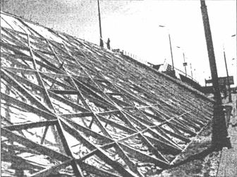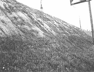 Рис. 19. Оползень на МКАД (км 98, внутренняя сторона кольца, 2003 г.) Ниже приведены результаты некоторых наблюдений [13]. 1. Количество и общая площадь повреждений откосов растет из года в год, ежегодный прирост составляет приблизительно 20 %. 2. Повреждения, вызванные природными и антропогенными факторами, находятся в приблизительно равном отношении. 3. Повреждения, вызванные природными факторами, имеют ярко выраженный сезонный характер. Так, наибольшее количество оползней появляется весной сразу после схода снега и оттаивания почвы, когда грунт максимально насыщен влагой. Размыв же откосов и насыпей происходит большей частью в летний период и вызван ливневыми дождями. 4. На количество повреждений влияет ориентация откосов по сторонам света. Так, в 2004 г. 80 % оползней приходилось на северные склоны откосов МКАД. Это вызвано более низким испарением влаги в дневное время, чем на южных склонах. Аварийный ремонт поврежденных откосов и насыпей начинается с определения причин возникновения повреждений, и только после их анализа принимается конкретное техническое решение, учитывающее все факторы, влияющие на состояние данного откоса. Все многообразие технических решений, которое при этом возникает, можно свести в итоге к определенному набору действий [13]. 1. Ремонт размывов насыпей и откосов. Поскольку причины размывов, как правило, носят антропогенный характер, проводятся мероприятия по перехвату ливневых потоков на гребне откоса. Это либо восстановление бортовых камней, либо устройство перехватывающих продольных и водоотводящих поперечных лотков. После этого проводятся восстановительные работы. 2. Устранение оползней на откосах. В первую очередь удаляется сползший грунт из продольных водоотводящих лотков. Как правило, для этого используется экскаватор типа Татра УДС-110. Экскаваторы этой марки мобильны, имеют высокую производительность, ковш экскаватора может работать в разных плоскостях, что снижает риск механического повреждения продольного водоотводящего лотка в процессе работы. После погрузки грунта в автомобили-самосвалы и вывоза его на свалку приступают к выравниванию кромок места повреждения откосов. Для исключения дальнейшего размыва откоса грунтовыми водами дно промоины выстилают геотекстилем. После этого начинается монтаж деревянного каркаса из обрезной доски (рис. 20). В данной конструкции деревянная клетка каркаса выполняет несколько функций [13]: - с ее помощью восстанавливается или изменяется геометрия откоса, что особенно актуально, когда площадь восстанавливаемого откоса превышает 1000 м2 (например, при ремонте откоса на Бережковской набережной площадью 1500 м2 с помощью деревянной клетки каркаса был уменьшен его угол заложения); - является важнейшей частью несущей конструкции, особенно в случаях, когда откос восстанавливается не до самого гребня; - удерживает песок от оползания при монтаже последующих технологических слоев.