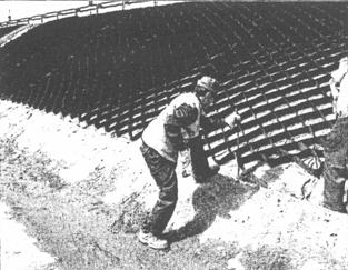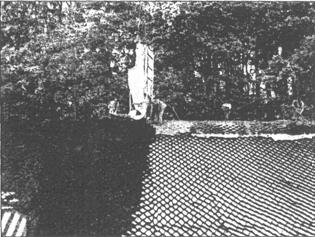 Рис. 22. Отсыпка на откосе растительного грунта Основной задачей профилактического ремонта является, с одной стороны, создание прочной механической конструкции, препятствующей в дальнейшем возникновению сползания грунта с откоса, с другой стороны - обеспечение условий развития хорошего травостоя, что помимо декоративной функции способствует стабильности откоса. Критериями целесообразности проведения профилактического ремонта откоса могут служить следующие факторы: - на этом откосе не менее двух раз уже производился аварийный ремонт; - наличие эрозийных и механических повреждений откоса; - угнетенный травостой на откосе. Суть технологии профилактического ремонта заключается в том, что на поверхности ремонтируемого откоса создается многослойная конструкция, где каждому слою отводится определенная роль. На первом этапе на откосе монтируется георешетка и укрепляется стальными нагелями в соответствии с определенной схемой крепления (рис. 24).
