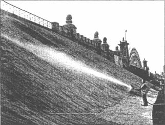 Рис. 23. Полив воды по мешковине Далее георешетка засыпается растительным грунтом с последующим внесением минеральных удобрений. Данный слой растительного грунта, богатый органикой и минеральными веществами, обеспечивает запас плодородия будущего травостоя на 3 -5 лет (рис. 25). Следующий технологический слой из МАК-мата и стальной сетки выполняет двойную функцию: с одной стороны, он удерживает верхний слой растительного грунта, а с другой стороны - обеспечивает основную механическую прочность конструкции (разрывная нагрузка данной конструкции составляет порядка 30 кН/м). Посеянные семена газонной травы заделываются в растительный грунт и укрываются мешковиной. После обильного полива в течение 10 - 15 дней происходит прорастание семян и после их укоренения мешковина снимается. Созданная на откосе плотная дернина, переплетаясь корнями с МАК-матом, обеспечивает оптимальный водно-воздушный режим и препятствует эрозии почвы [13].