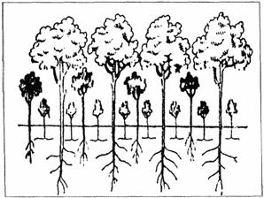 Рис. 26. Схема трехъярусного фитоценоза 7. ОСОБЫЕ СЛУЧАИ ПРИМЕНЕНИЯ БИОЛОГО-ТЕХНИЧЕСКИХ МЕТОДОВ УКРЕПЛЕНИЯ ОТКОСОВ АВТОМОБИЛЬНЫХ ДОРОГПри прохождении автомобильных дорог в районах возможного образования оврагов, оползней и других опасных явлений предусматривают комплекс мероприятий по борьбе с водной и ветровой эрозией на сопряженных с автомобильной дорогой участках ландшафта. Такой комплекс может включать организационно-хозяйственные, агротехнические, лесомелиоративные и гидротехнические мероприятия. Однако возможность применения агротехнических средств ограничена крутизной склонов, как правило, до 4 - 5°. Что касается лесомелиоративных мероприятий, то их результаты могут проявиться не сразу, а только через 5 - 10 лет. Поэтому для прекращения эрозии применяют гидротехнические приемы, среди которых биологические методы играют определенную роль. В числе мероприятий против водной и ветровой эрозии проектируют системы перехвата дождевых и талых вод в верховьях оврагов и на оползневых склонах, посадку леса и кустарников для закрепления склонов, выполаживание склонов, устройство барражей по дну оврагов для локализации эрозии и размывов. Следует обратить внимание на то, что проектные организации еще не всегда с должной ответственностью подходят к назначению противоэрозионных мероприятий. Гидротехнические сооружения в системе противоэрозионных мероприятий можно разделить на несколько видов: сооружения на водосборной площади, вершинные овражные сооружения и донные сооружения. Противоэрозионные сооружения на водосборной площади представляют собой валы-террасы, водозадерживающие валы, распылители стока, направляющие валы и нагорные канавы. Этот тип сооружений полностью или частично ликвидирует сток и смыв почвы или опасную концентрацию стока в различных понижениях (ложбины и др.). Конструктивно - это простейшие земляные гидротехнические сооружения. К вершинным овражным сооружениям относятся перепады, быстротоки и консольные сбросы, устройство которых позволяет задержать развитие вершин оврагов. В большинстве случаев в качестве материалов для этих сооружений используются монолитный и сборный железобетон, реже дерево, плетни, фашины, камень. В некоторых случаях закрепление вершин оврагов с небольшими размывами производят путем их сполаживания и посева трав на образовавшемся водосборе. При этом крутизна наклонной площадки не должна превышать 5°. В задернованном водотоке допустимая максимальная скорость не должна превышать 1 м/с. С целью снижения скорости движения воды по дну оврагов и задержания продуктов размыва устраивают донные сооружения и выполняют лесные посадки. Из опыта противоэрозионного строительства известны следующие типы донных сооружений: запруды, донные перепады и пороги, барражи. Для получения наибольшего эффекта различные типы донных сооружений устраивают в сочетании с противоэрозионными мероприятиями, которые выражаются в заравнивании промоин и выполаживании оврагов или закреплении откосов оврагов травами, дерном, плетнями, камнем [32]. Дождевые и талые воды, стекающие с поверхности автомобильных дорог и мостов и содержащие вещества техногенного происхождения, являются источниками загрязнения водных объектов и при расположении объектов в водоохранных зонах в соответствии с т
