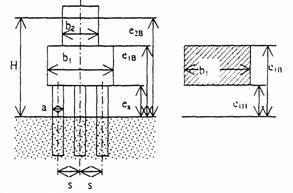 Рис. 2.3. Схема к определению расчетной ширины опоры на высоком свайном ростверке с числом свай в ряду N = 3 (справа выделен первый элемент) ен = eiв - высота обнаженных свай, равна расстоянию от дна до нижней грани плиты ростверка опоры. 2.3. Произведение расчетных величин bm·M в формуле (2.3) составной конструкции опоры из массивных элементов различной высоты, ширины и формы определяется в зависимости от удаленности элемента от поверхности дна по вертикали и формы элемента в плане из формулы: