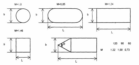 Рис. 2.4. Схема к определению коэффициента формы М элементов конструкции опор постоянного поперечного сечения 2.4. Расчетная ширина опоры b составной конструкции определяется из формулы (2.4) при М = Мi = 1. 2.5. Коэффициент формы М массивной опоры и фундамента с постоянной формой поперечного сечения в зависимости от планового очертания принимают по рис. 2.4. Расчетный коэффициент формы опоры М составной конструкции определяется из формулы (2.4) при действительных значениях Мi путем деления на величину bm. 2.6. Произведение расчетных величин bm·M в формуле (2.3) опоры составной конструкции из массивных элементов и высокого свайного ростверка (на столбчатых фундаментах, рис 2.3) определяется по формуле: