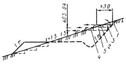 1 - точки закрепления оси трассы; 2 - точки закрепления верхней бровки относа; 3 - места установки откосного лекала (шаблона).