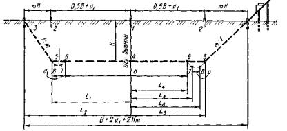 2.3. Разбивку выемки в равнинной местности (рис. 1) начинают с забивки по оси дороги колышков 1, на которых указывают глубину (рабочая отметка) выемки Н в данной точке. Затем перпендикулярно к оси откладывают значение L1 = 0,5B+а1 (колышки 2); отмечают верхнюю линию откоса (L2= 0,5B + а1 + Hm), забивая колышки 3 или устанавливая вехи. В процессе устройства выемки при помощи лекал проверяют правильность заложения откосов и глубину выемки.