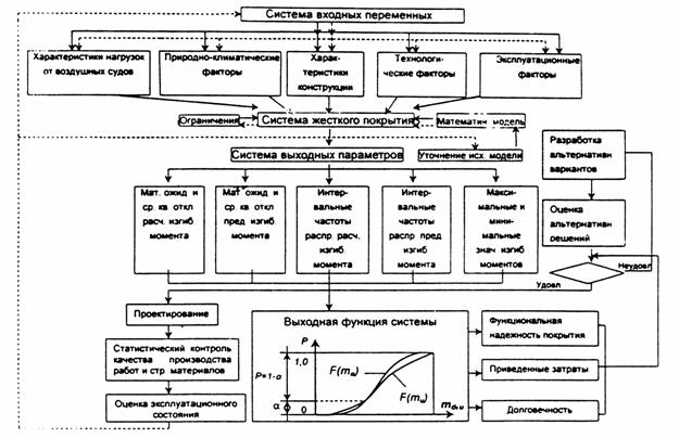 где md и mu - соответственно величины расчетного и предельного изгибающих моментов, Применяемое в результате расчета сравнение вариантов конструкций покрытий по единственному критерию - приведенным затратам на их сооружение - без оценки надежности принятых решений на стадии проектирования не обеспечивает выбора оптимальных решений, так как при этом игнорируются следующие аспекты: вероятностно-статистические закономерности распределения эксплуатационных нагрузок от колес воздушных судов и температуры, прочностных и деформационных характеристик материалов, а также геометрических характеристик конструктивных слоев жесткого аэродромного покрытия. Дальнейшее совершенствование методики расчета и обеспечения требуемой надежности аэродромных и дорожных покрытий на стадии проектирования возможно на основе использования методологии системного подхода, центральной процедурой которого является построение обобщенной модели инженерной конструкции или сооружения. Разработке обобщенной модели конструкции жесткого аэродромного покрытия посвящена работа В.Е. Тригони /1/, в которой предусмотрен учет надежности принимаемого решения конструкции цементобетонного (армобетонного) покрытия введением коэффициента условий работы, предложенного В.Д. Садовым и учитывающего изменчивость лишь двух факторов: прочности цементобетона на растяжение при изгибе и величины температурных напряжений в цементобетоне. При этом не учитывается стохастическая природа таких входных переменных, как деформационные характеристики грунтовых и искусственных оснований, взлетные массы воздушных судов, распределение нагрузок от колес главных опор по ширине участков аэродромных покрытий и геометрические характеристики конструктивных слоев. В связи с этим одной из актуальных задач развития обобщенной модели системного подхода к проектированию искусственных покрытий аэродромов и дорог является усовершенствование модели подсистемы оценки надежности жестких одежд с учетом перечисленных факторов. Ниже приведена блок-схема предлагаемой модели подсистемы оценки надежности жесткого аэродромного покрытия на стадии проектирования (рис.). Модель подсистемы оценки надежности включает систему входных параметров: нагрузки от воздушных судов, важнейшими характеристиками которых являются: взлетная масса воздушного судна, количество главных опор, доля взлетной массы, приходящаяся на главные опоры, число и схема компоновки колес на главной опоре и давление в шинах; расчетное число приложений нагрузки за проектный срок службы;