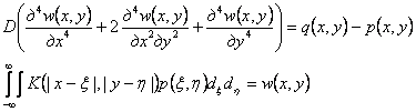 Здесь D - цилиндрическая жесткость плиты; p(x,y) - функция контактных напряжений; K(|u|,|v|) - ядро основания - функция, выражающая прогиб основания в точке X, Y при действии единичной силы, приложенной в точке ξ, η. Введем вспомогательную величину