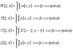 В дальнейшем для упрощения опустим индекс "1". При действии на плиту произвольной нагрузки q(х,у) ее можно представить в виде симметричной и кососимметричной составляющих. Для симметричной составляющей нагрузки при решении дифференциально-интегральной системы (9) используем двумерное косинус-преобразование функций Фурье w(x,y), p(x,y), К, q(x,y).